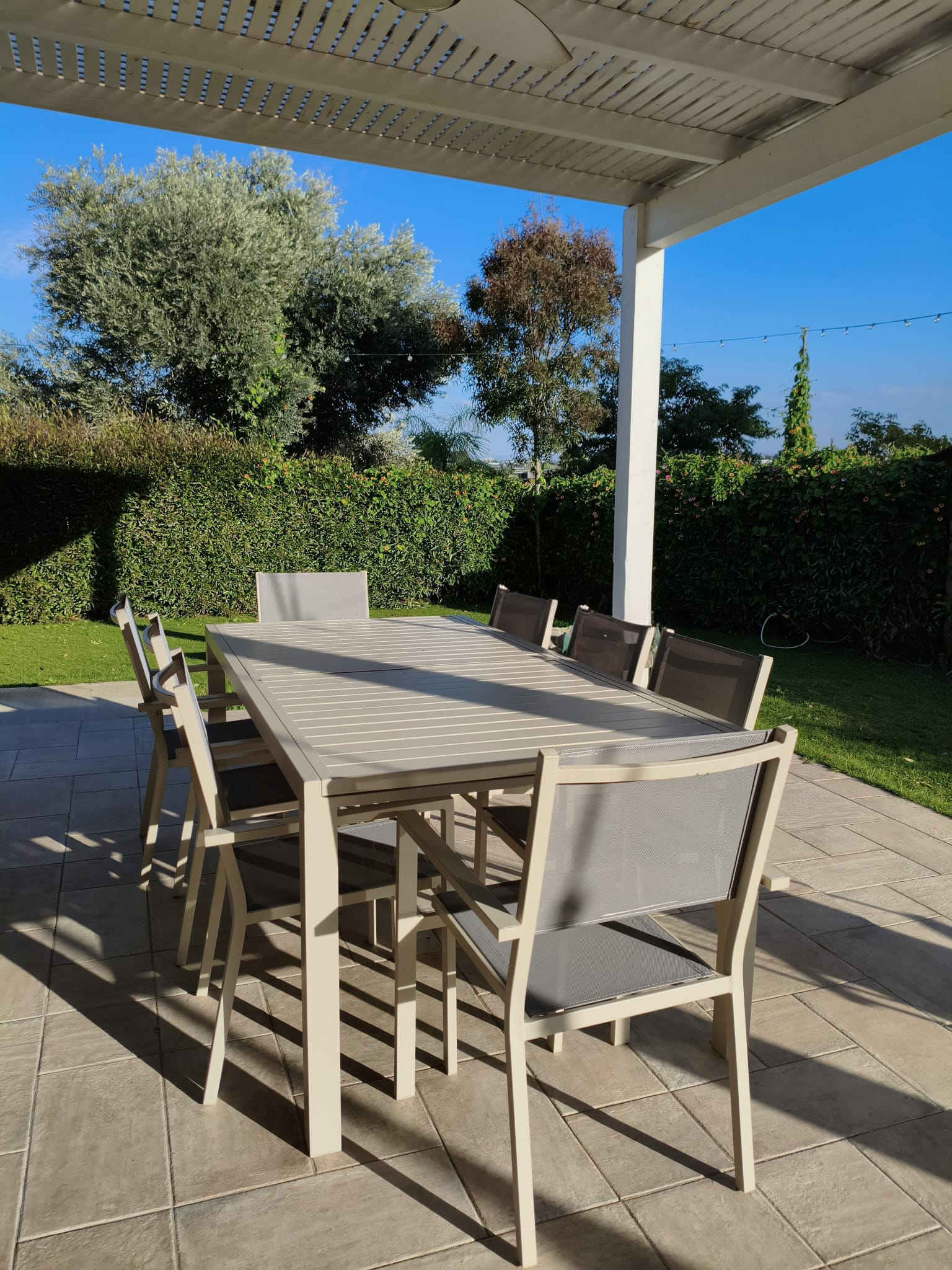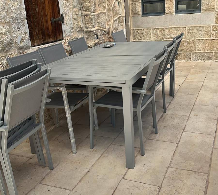 8 כיסאות אלומיניום משולבים בבד טקסליין כפול, לנוחות ישיבה מרבית ולשימוש ממושך.